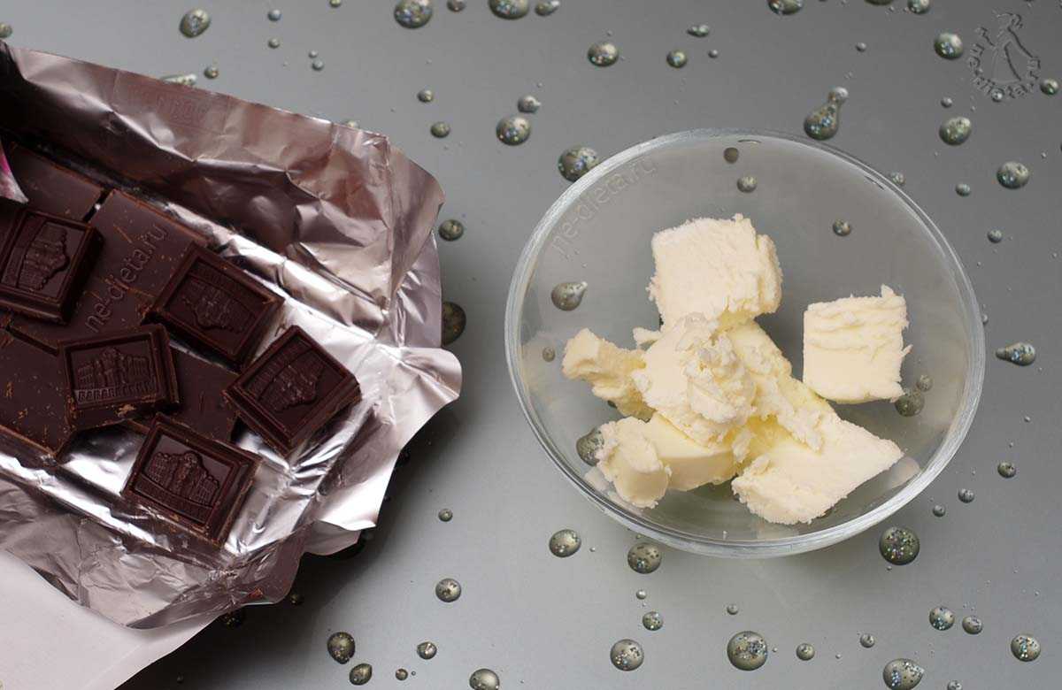 11. Далее, чтобы сделать на печенье устрашающий черный рисунок, надо порубить на небольшие кусочки темный шоколад и сливочное масло, после чего совместно растопить их на водяной бане или в микроволновке.