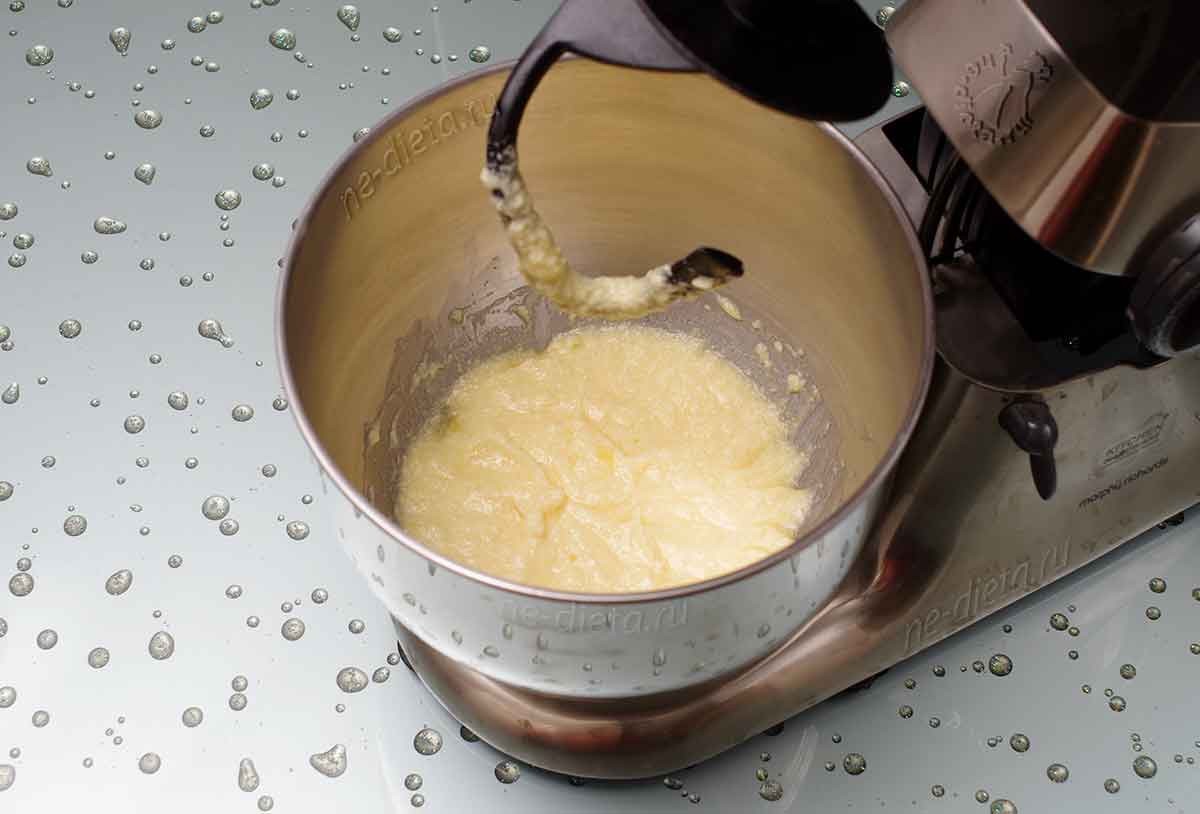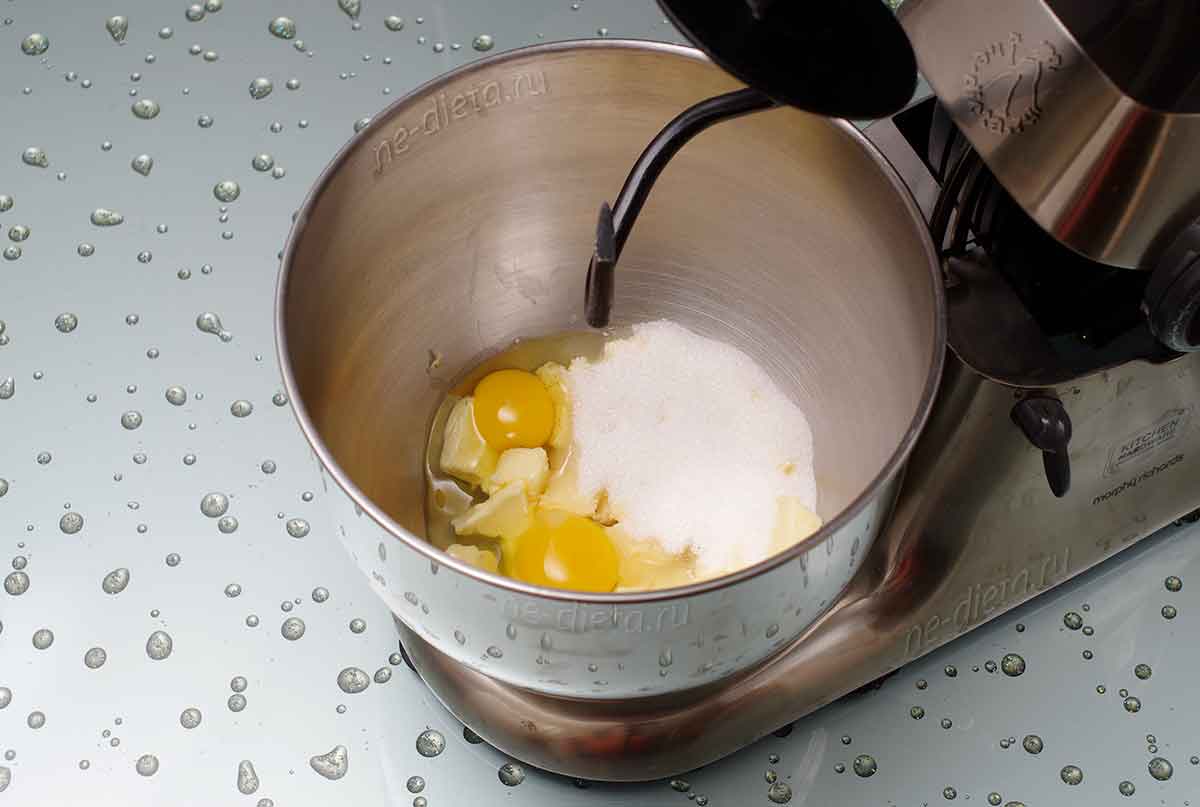 - Сливочное масло перетрите вместе с сахаром. Добавьте в массу яйца и вымешайте.