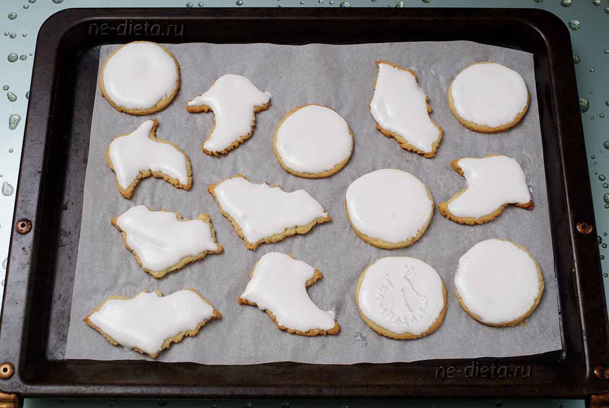 10. Получившейся глазурью надо покрыть поверхность печенья с помощью чайной ложки, стараясь не затягивать эту процедуру, так как белковая глазурь через какое-то время может засохнуть.