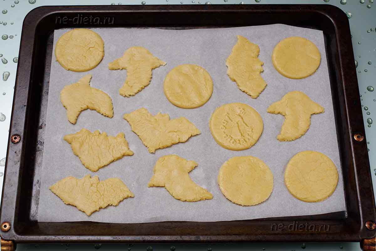 - Из подготовленного теста сформируйте фигурки, кружочки, цветочки и т.д. и положите на противень, присыпанный мукой или покрытый пергаментной бумагой. Можно также использовать формочки.