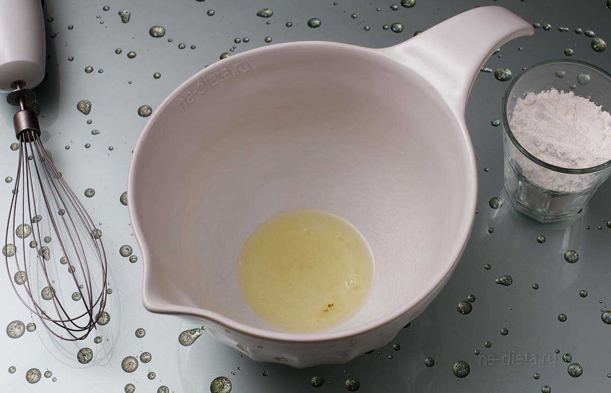 Предварительно охлади яйца. Белок аккуратно отдели от желтка, добавь щепотку соли и взбей миксером до образования пышной пены. Не останавливаясь, постепенно добавь в эту массу сахар.