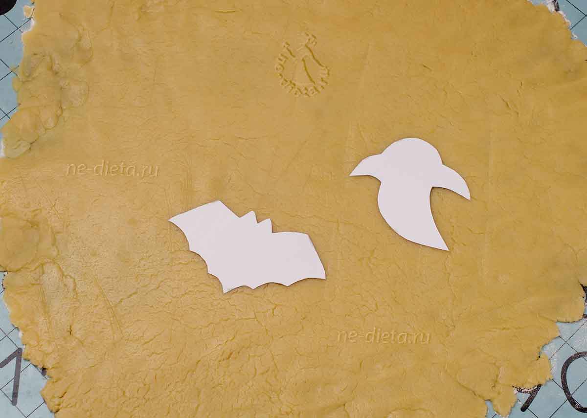 5. Когда тесто хорошо охладится и слегка затвердеет, его нужно раскатать в пласт толщиной 5 мм на присыпанной мукой поверхности. Затем из теста надо вырезать фигурки с помощью любых формочек или трафаретов в тематике Хэллоуина. Я сделала трафареты из картона в виде летучих мышей и привидений. Кроме того, если не хочется возиться с изготовлением трафаретов, можно из теста выдавить стаканом кружки, которые потом оформить глазурью в виде паутинки.