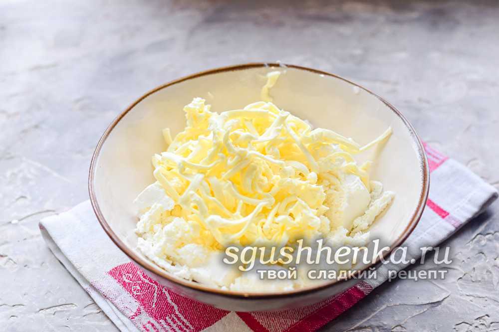 Масло заморозить. Натереть на терке. Переложить в миску с творогом. Сюда же вбить яйцо.