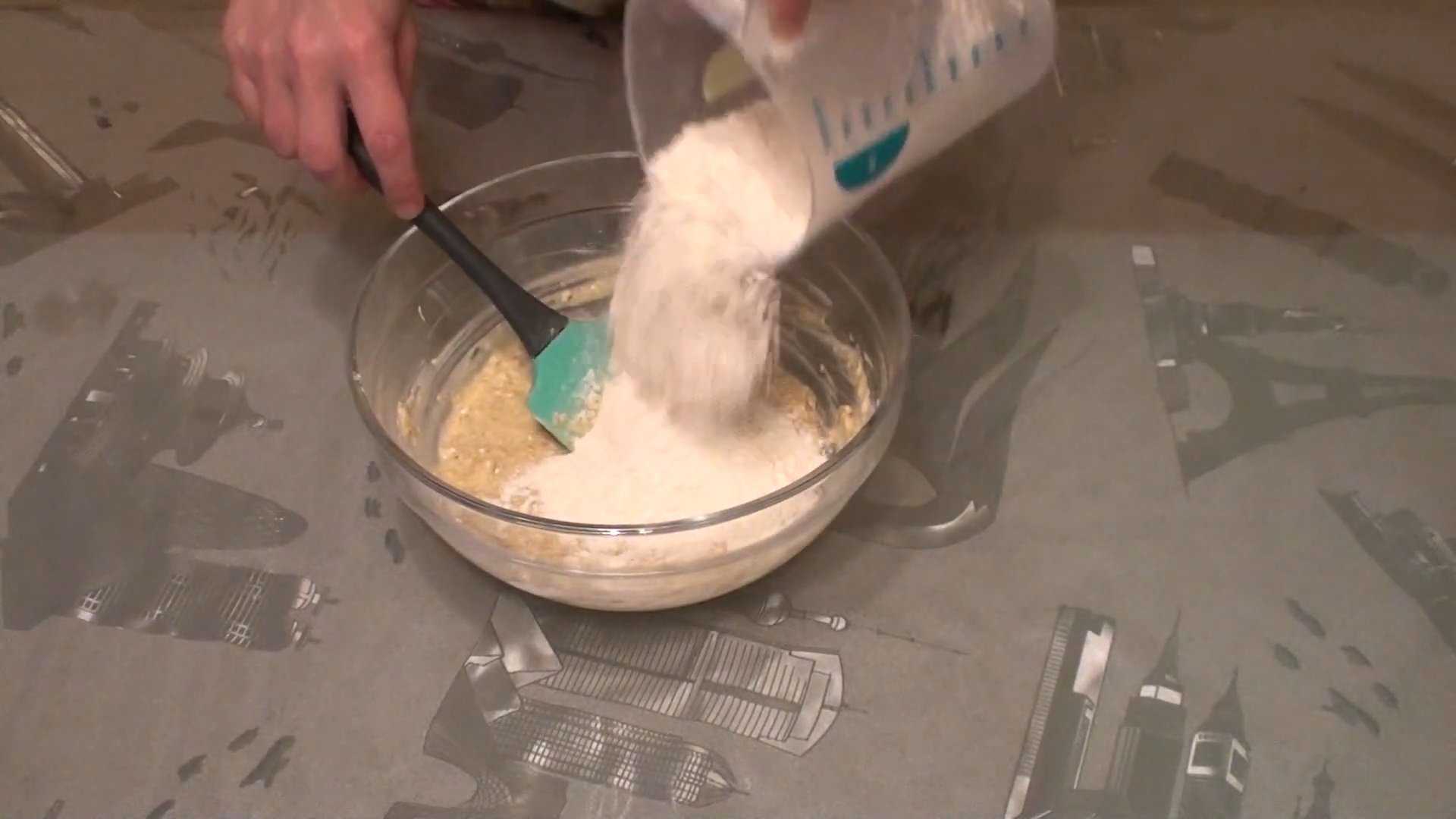 - Добавляем 115 грамм муки в сливочно-овсяную смесь, но делать это нужно постепенно, по 1 ст. л. На этом этапе можно начинать вымешивать тесто руками.