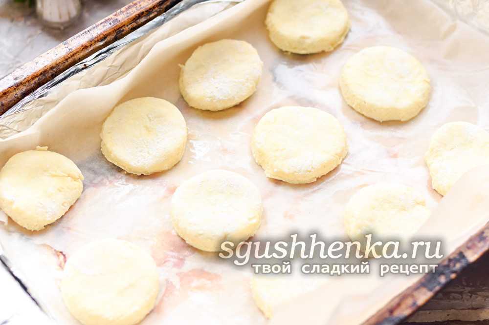- Смазать поверхность противня кусочком сливочного масла или посыпать мукой. Переложить изделия из теста на его поверхность и поставить на выпекание в духовку. Чтобы печеньки не пригорели и получились румяными нужно включить температурный режим на 170-180 градусов и через пятнадцать минут их достать.