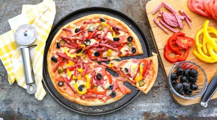 Простая пицца с колбасной начинкой и сыром на дрожжевом тесте, запеченная в духовке