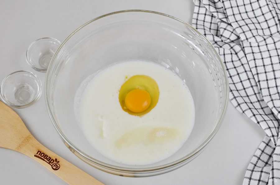 Кефир перед началом готовки необходимо подогреть настолько, чтобы он стал теплым, чуть теплее комнатной температуры. Перегревать нельзя – получится творог и сыворотка. Вылить его в миску, добавить половину крупного яйца. Чтобы разделить его пополам, нужно вбить его в отдельную емкость, взболтать вилкой, отлить примерно 1/2 часть.