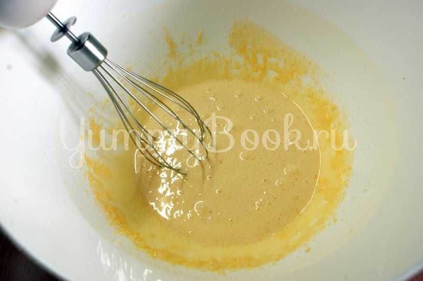 В отдельную емкость насыпьте сахар, добавьте два желтка и размешивайте. Цвет смеси должен получится белым.