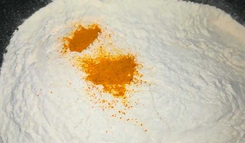 - В центре сделать небольшую ямку и в нее всыпать дрожжи;
