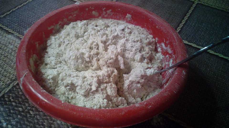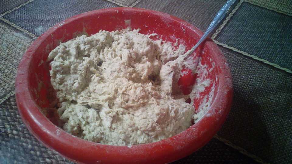 - Все тщательно перемешать – можно ложкой, можно рукой. Тесто будет липким и густым.