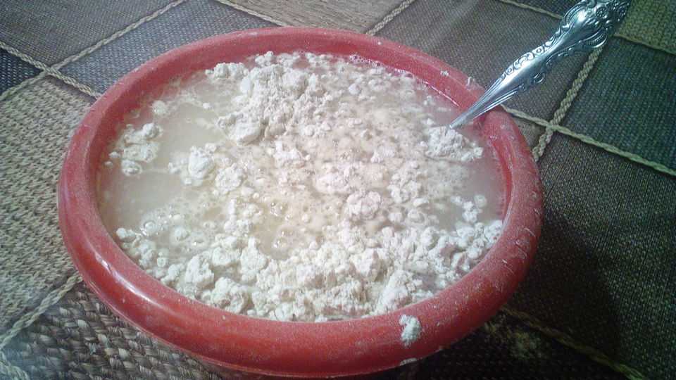 - После этого его перемешивают, добавляя 2 столовые ложки муки, причем ее вид должен быть аналогичен той, которая использовалась для выращивания закваски, а также 50 миллилитров воды, температура которой должна равняться 25 градусам.