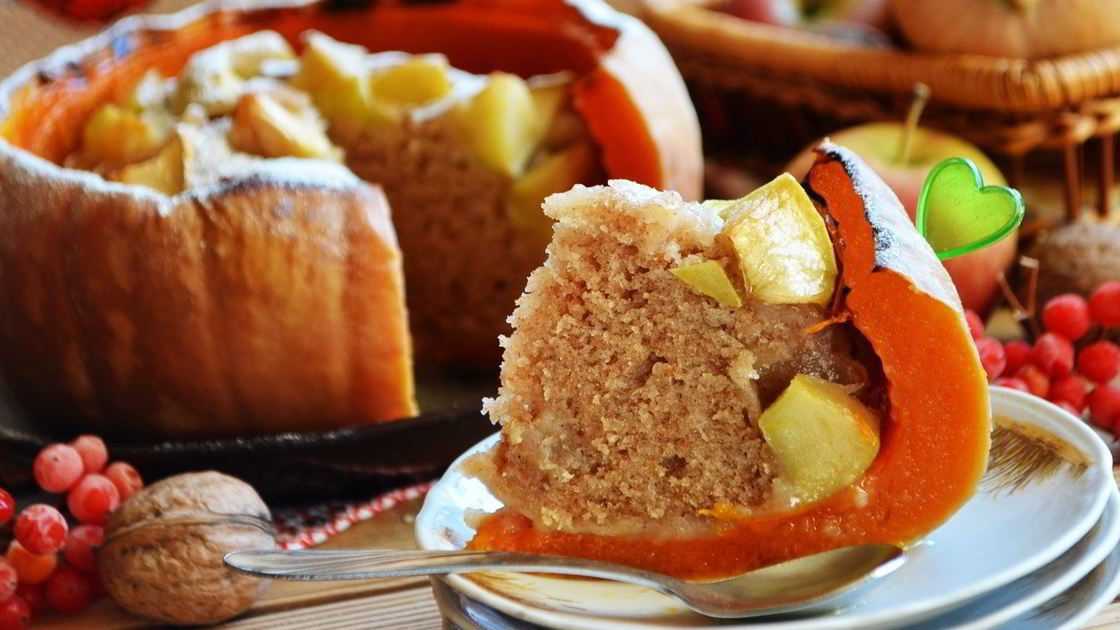 Рецепт отличается нестандартной подачей. Пирог запекается в тыкве, которая дает свой вкус и аромат. Подать такое блюдо можно на праздник и просто к чаю. Не стоит выбирать крупную тыкву, поскольку в ней тесто может остаться сырым.