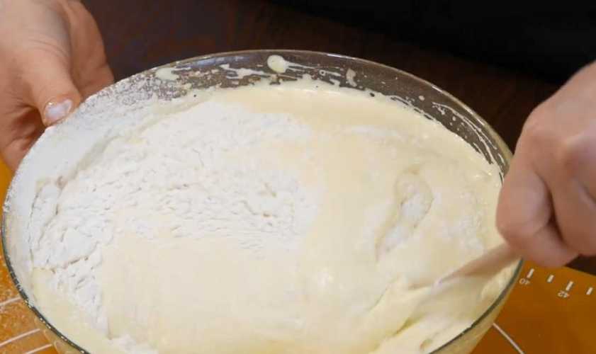 3. Всыпать муку в несколько этапов и замесить на слабых оборотах миксера тягучее жидкое тесто, можно воспользоваться силиконовой лопаткой. Долго вымешивать не стоит, так ка яйца могут опасть и тесто станет забитым и плотным. Вмешалась сухая мука в тесто и достаточно.