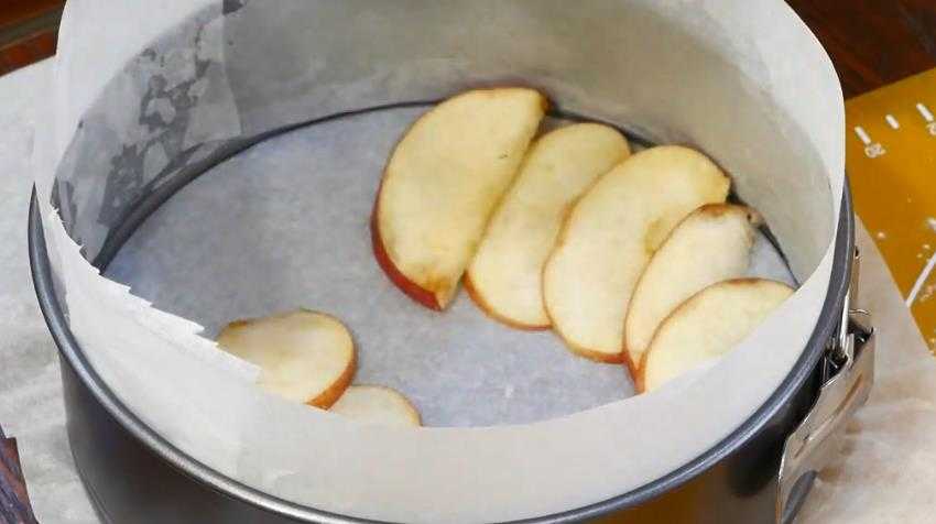 Дно формы для выпечки застелить пекарской бумагой. Смазать бумагу и бока формы сливочным или растительным маслом. Выложить на дно формы примерно половину приготовленного теста и разровнять его ложкой. Уложить на тесто половину яблочных ломтиков. Сверху яблоки слегка посыпать сахаром.