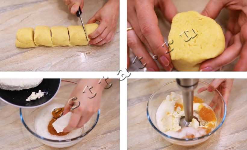 1.Сразу нужно сделать начинку. Если творог у вас зернистый, его нужно предварительно перетереть через сито. Если он мягкий, то так и оставьте, просто разомните ложкой.