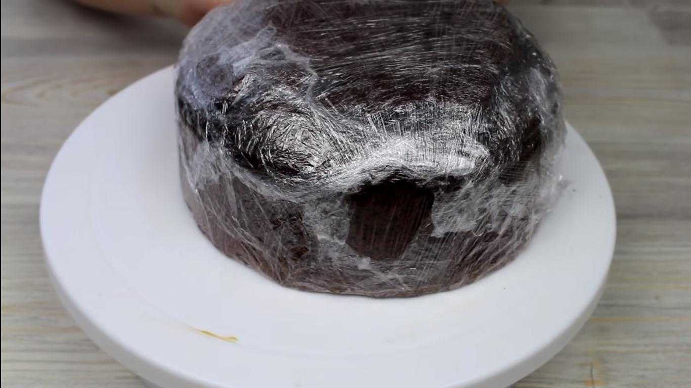 Потом извлекла пирог с помощью вставки для приготовления на пару, сняла бумагу и полностью его остудила. Мне нужен был корж через 4 дня с момента выпечки (возможности его приготовить в другом месте не было, а тортик нужно было собирать), поэтому остывшим я завернула его в пищевую пленку, обернула фольгой и хранила до необходимости в холодильнике. Спустя 4 дня шоколадный пирог был свежайший, стал еще сочнее, нежнее и более насыщенным по вкусу — дозрел, так сказать.