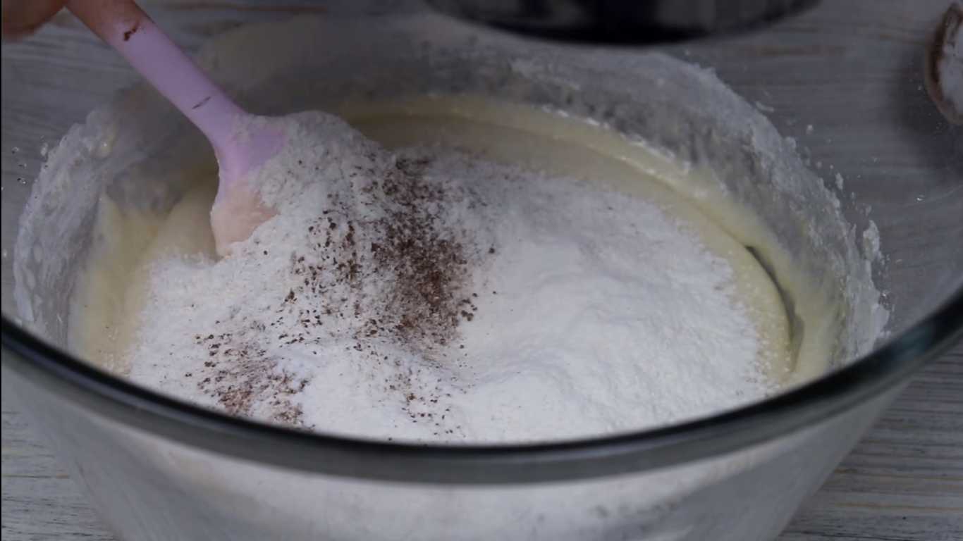 - В просторную миску высыпаем просеянную муку, добавляем все сухие ингредиенты для шоколадного пирога.
