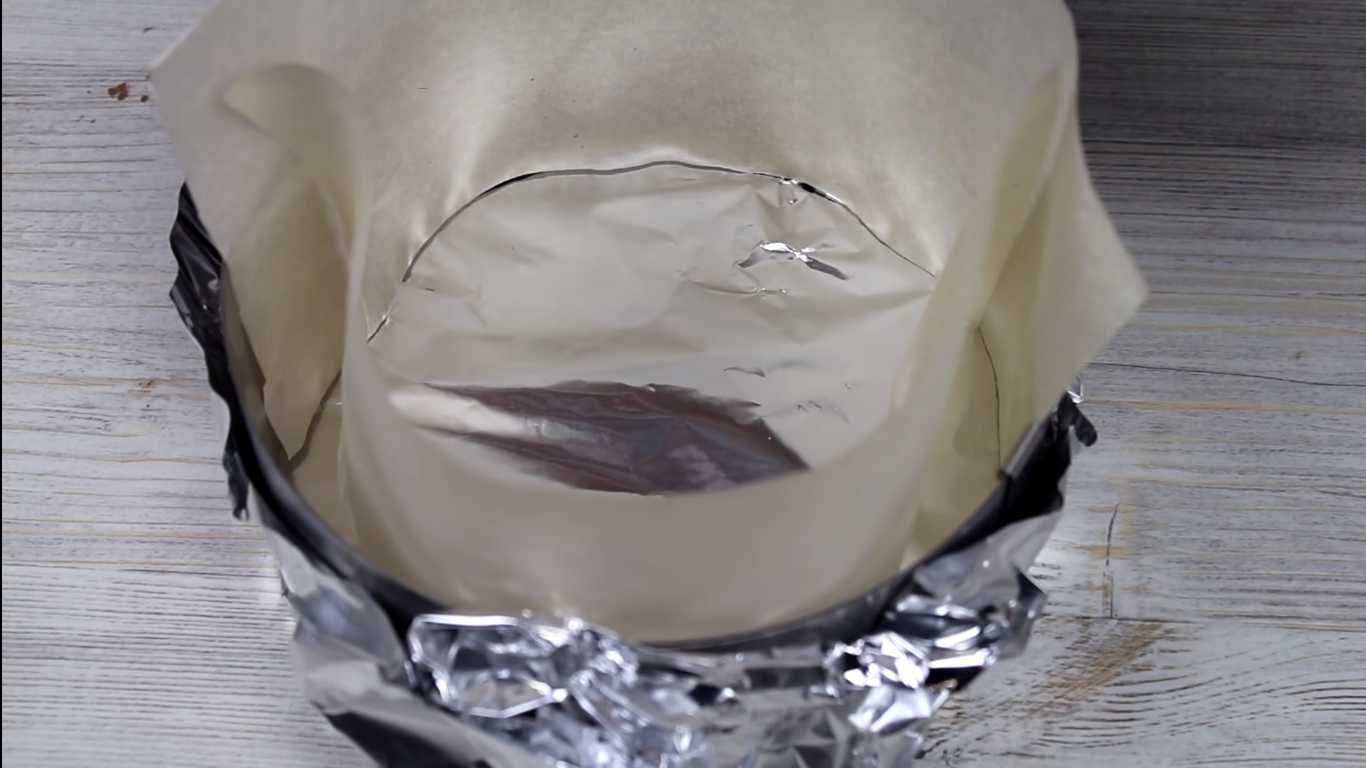 При выборе формы за выпечки вы должны ориентироваться на то, что тесто увеличится в объеме в 2-3 раза. То есть сырое тесто должно занимать максимум треть от всей высоты формы — я взяла разъемную диаметром 20 сантиметров. Дно и бока застилаем пергаментной бумагой, смазывать ничем не нужно. Выкладываем шоколадное тесто для пирога.