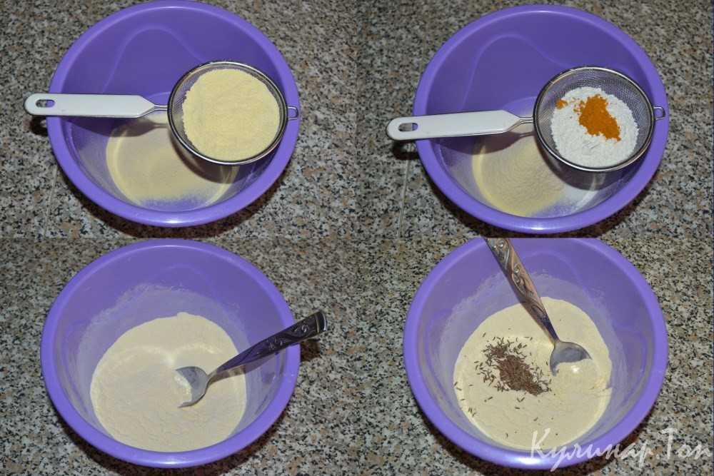 Кукурузную и пшеничную муку, половину чайной ложки куркумы просеиваем в миску. Добавляем остальные сухие компоненты: сахарный песок, соль, разрыхлитель, тщательно перемешиваем. Добавляем 1-2 столовых ложки тмина и еще раз перемешиваем, равномерно распределяя тмин.