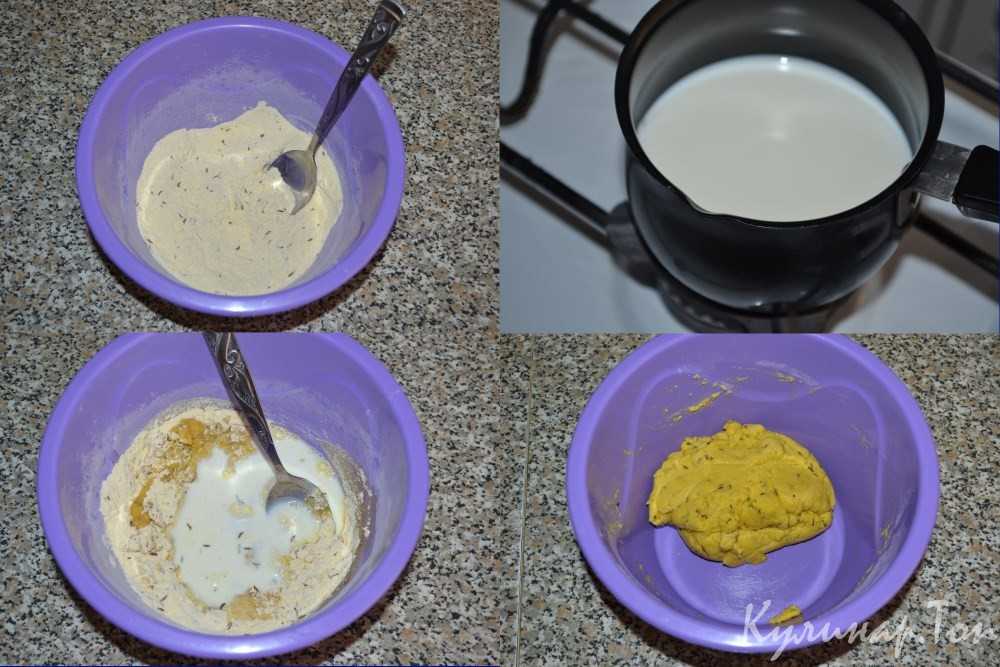 Вливаем растительное масло. Немного прогрев на плите, вводим молоко и замешиваем тесто. В результате получаем пластичное, не липнущее к рукам и в меру маслянистое тесто яркого желтого оттенка с контрастным вкраплением из тмина.