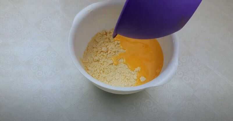 Теперь соедините две массы между собой, замесите тесто. Для этого яичную смесь добавьте к крошке из муки и сливочного масла.