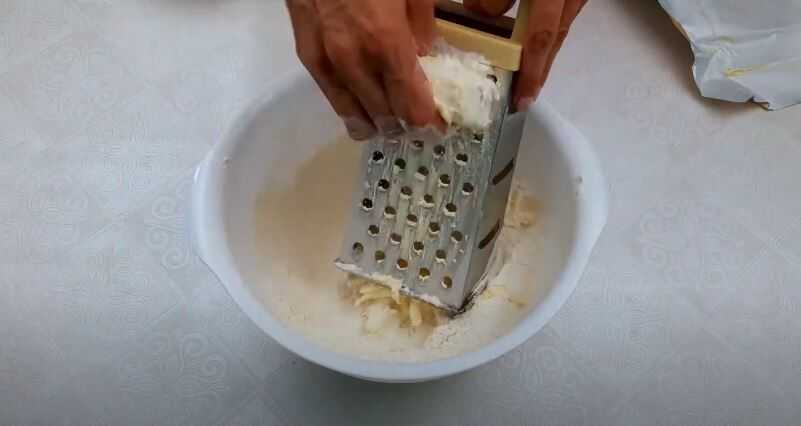 4. Спустя время. Когда тесто хорошо схватится, заморозится натрите больший кусочек на крупной терке. Заранее застелите противень пергаментом.