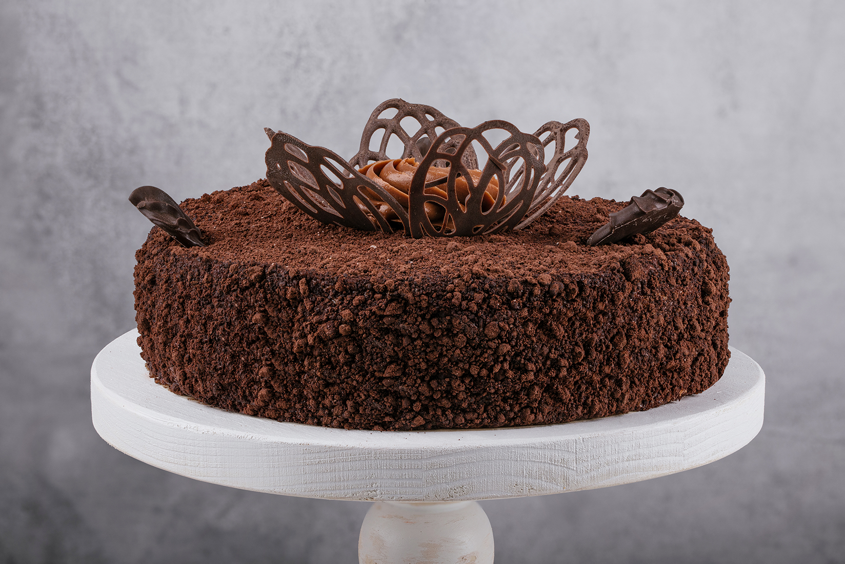 Оставшуюся бисквитную мякоть измельчаем на крошку и обсыпаем ею бока торта.