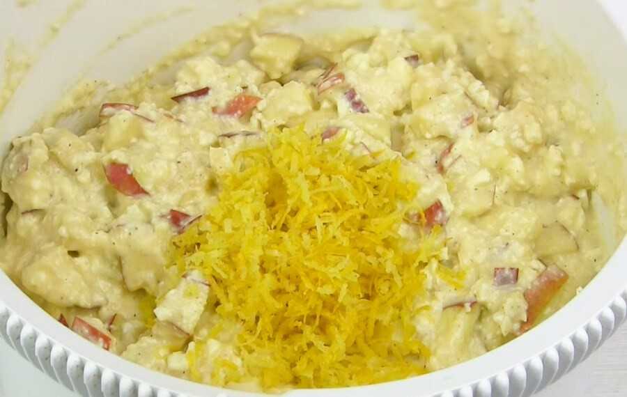 Сначала подготовим фрукты к выпеканию, им нужно дать немного настояться — как раз пока мы будем замешивать тесто, этого времени будет вполне достаточно.