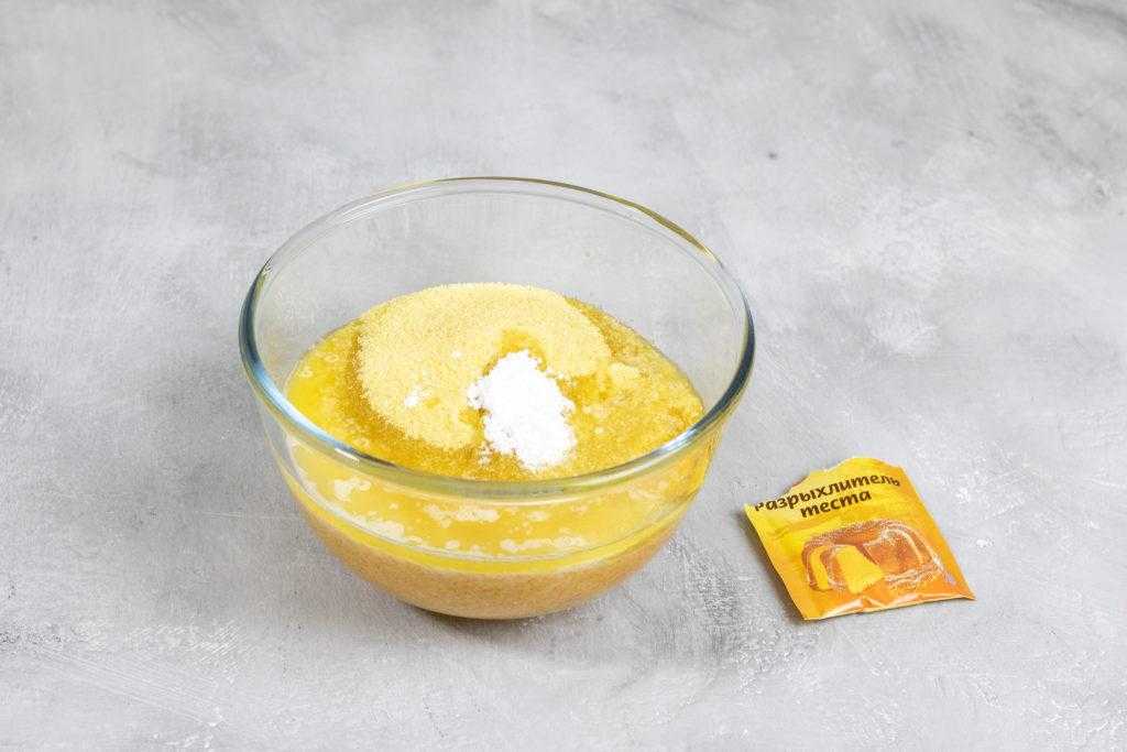 5. В муку высыпаем разрыхлитель и просеиваем к жидким ингредиентам в миске.