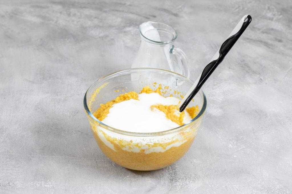 - В последнюю очередь добавьте в тесто сметану. Она сделает структуру теста более влажной, нежной на вкус. В последний раз вымешайте готовое тесто для будущей выпечки.