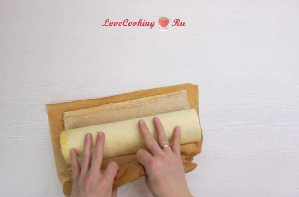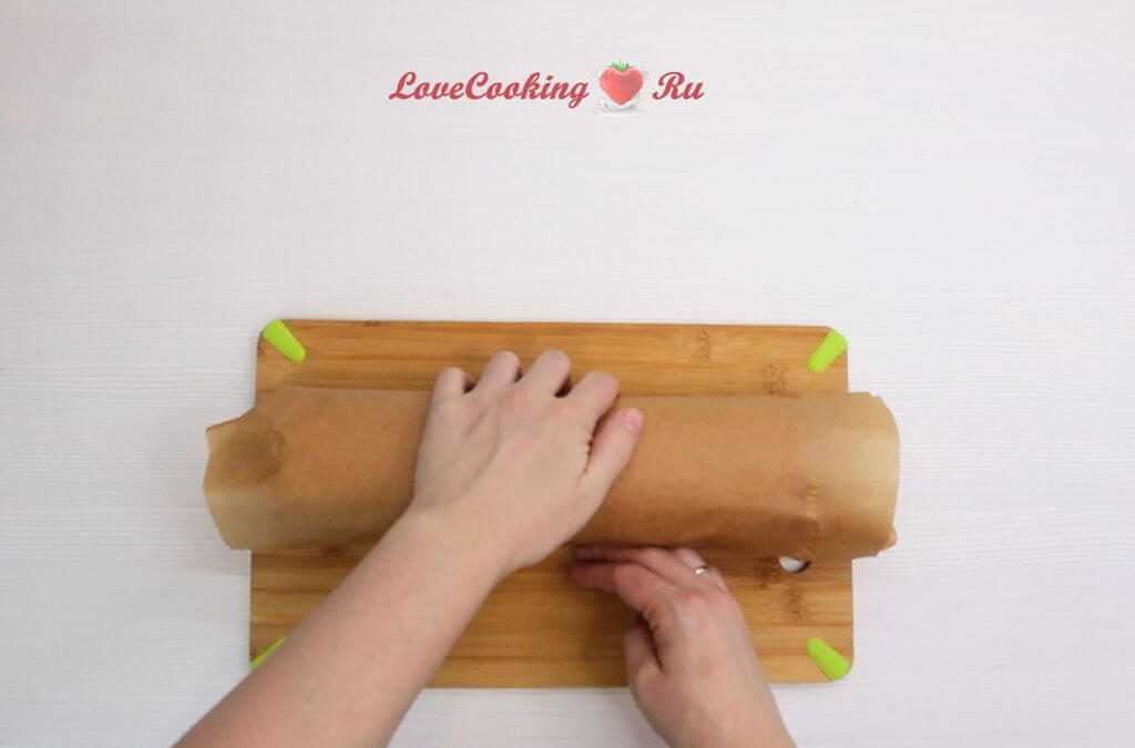 С помощью пергамента сворачиваем бисквит в рулет, хорошо его поджимая.