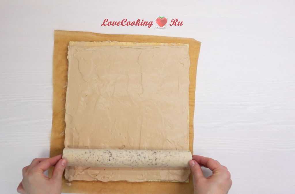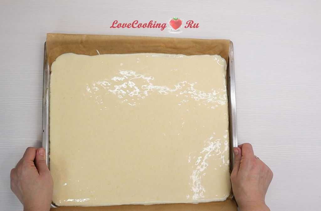 Перекладываем тесто на противень, застеленный пергаментной бумагой.