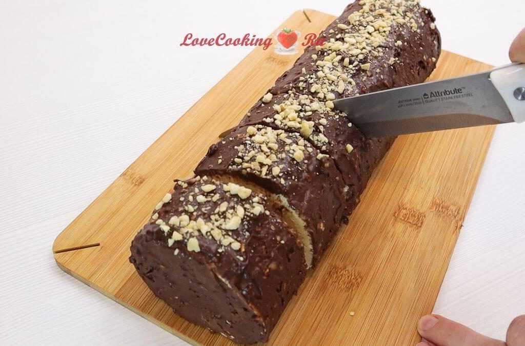 Бисквит разрезаем на коржи исключительно отлежавшийся в холодильнике. И сразу можно собирать из него торт. Приготовьте любимый крем, пропитайте бисквит сиропом и промажьте кремом.