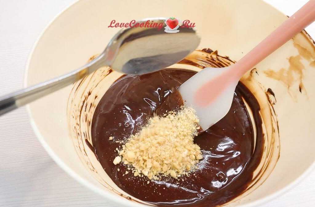 Ингредиенты:100 г тёмного шоколада80 г сливок 33-35%30 г измельчённых орехов