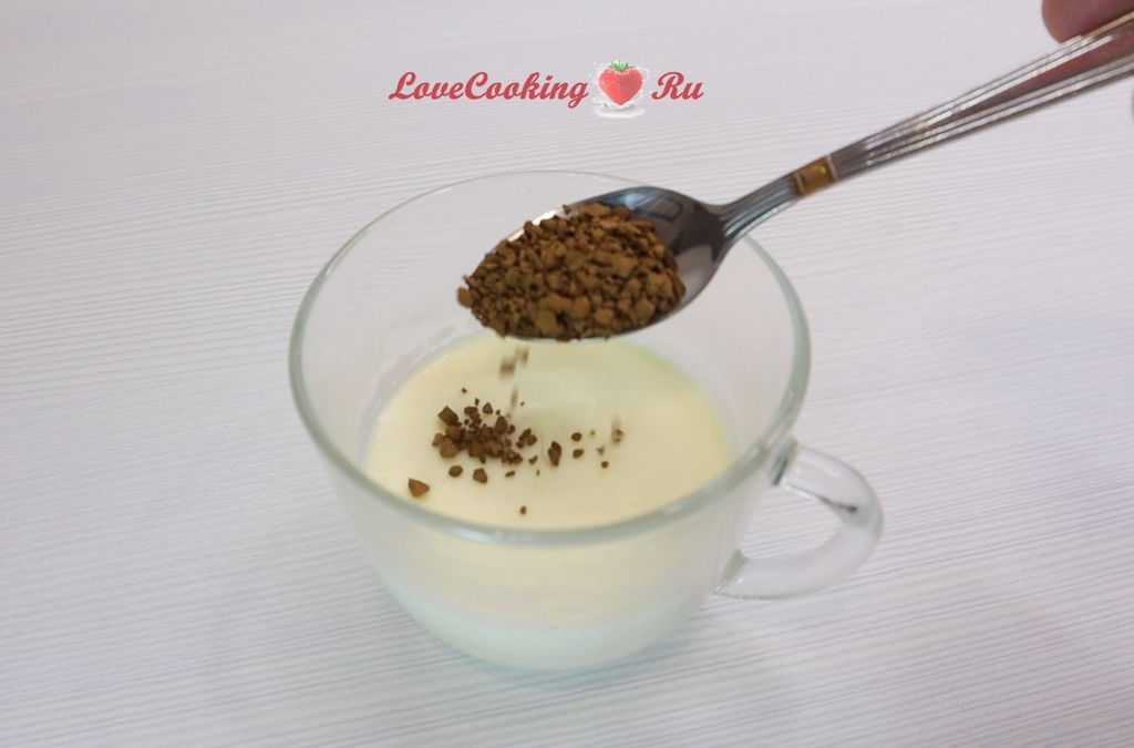 В горячей воде растворить кофе и какао-порошок. Дать смеси остыть до комнатной температуры.