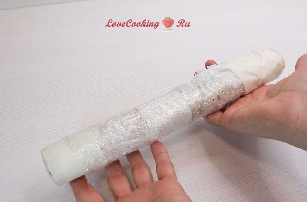 Из ацетатной плёнки делаем трубочку диаметром 3,5 см, длиной 28 см. Один конец хорошо заматываем пищевой плёнкой. Для надёжности я ещё прошлась бумажным скотчем.