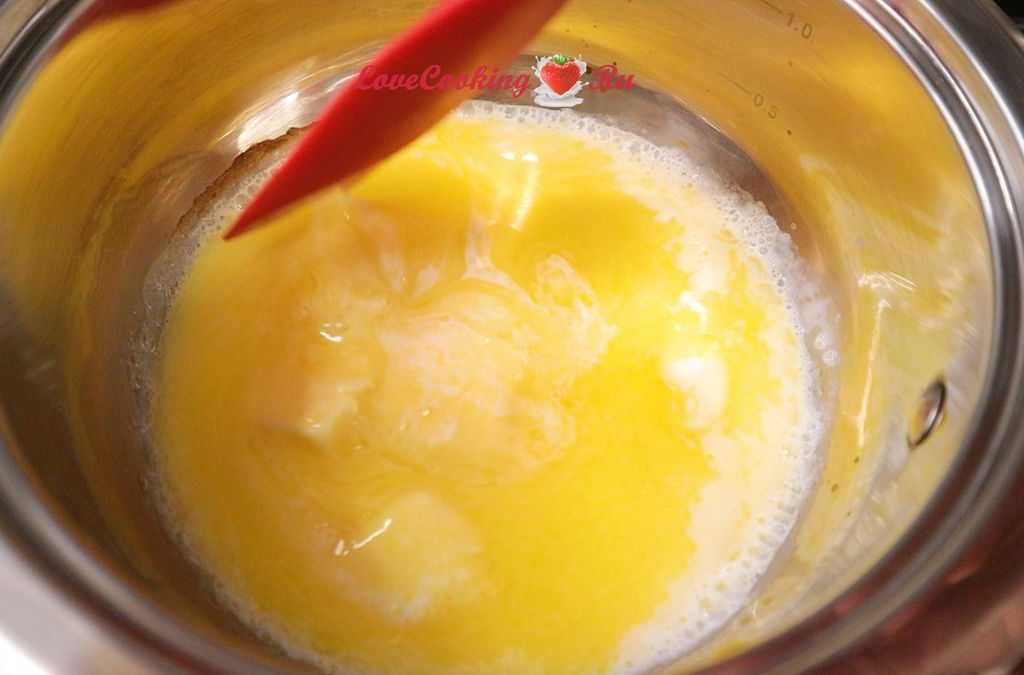 - Первым делом растапливаем сливочное масло и оставляем его в сторонке остывать. Оно нам понадобится позже для эластичности бисквита.