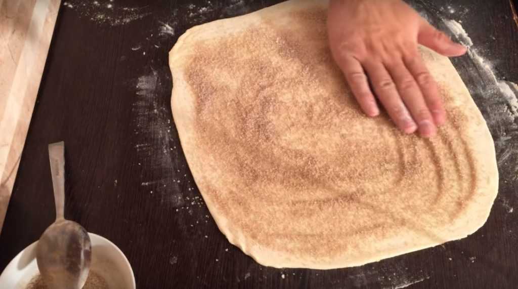 4. Катаем пласт толщиной в пол сантиметра. Сверху посыпаем сахаром, снова немного раскатываем тесто.
