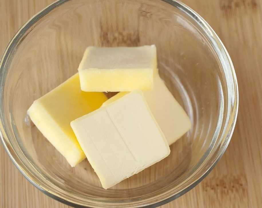 1. Свежий сливочный маргарин нарежьте на кубики, воспользовавшись острым ножом. Отложите кубики маргарина в удобную для вас емкость и уберите его в теплое место, чтобы маргарин подтаял.