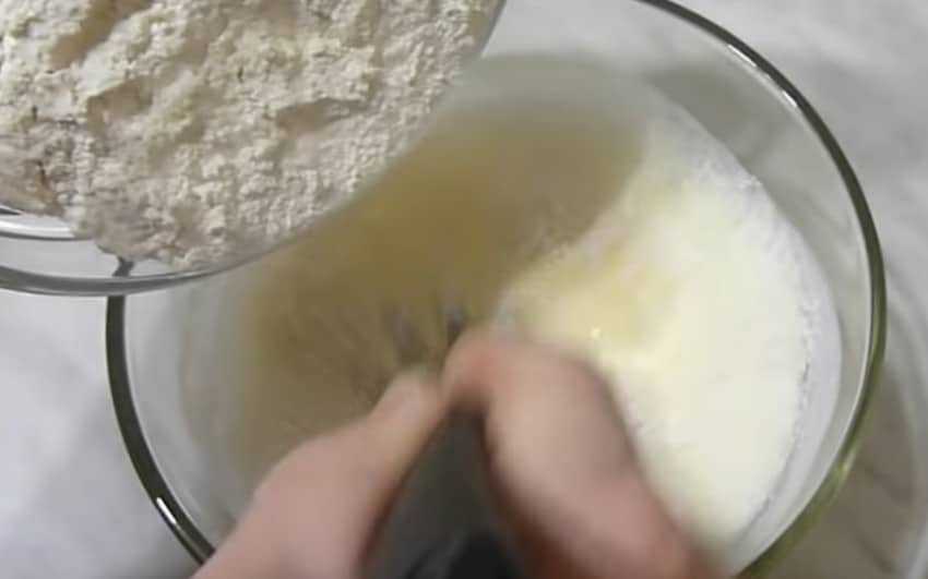 - Далее добавьте в кефирную смесь растительное масло и начинайте вводить просеянную муку небольшими порциями, все время хорошо вымешивая, чтобы не возникли комочки.