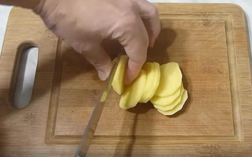 5. Картофель нарежьте тонкими кружками и залейте водой.