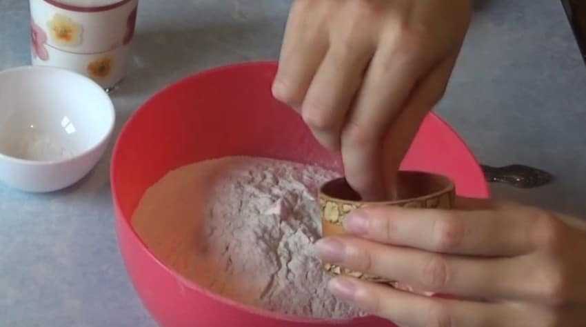 - Теперь понемногу подсыпать муку, замешивать до получения однородной массы – сначала ложкой, потом рукой. Если тесто липнет к руке, значит, муки мало. Подсыпать муку до тех пор, пока оно не начнет отлипать, станет эластичным.