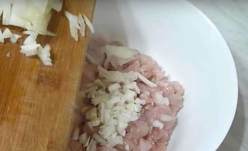 3. Куриное филе нарежьте на небольшие квадратики. Лук мелко нашинкуйте и добавьте к мясу.