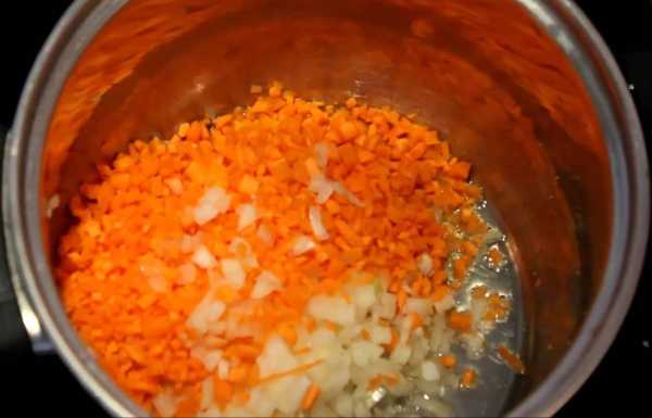 - Приготовим луково-морковную зажарку. В небольшом количестве постного масла обжарим лук до прозрачности. Затем добавим морковь и перемешаем.
