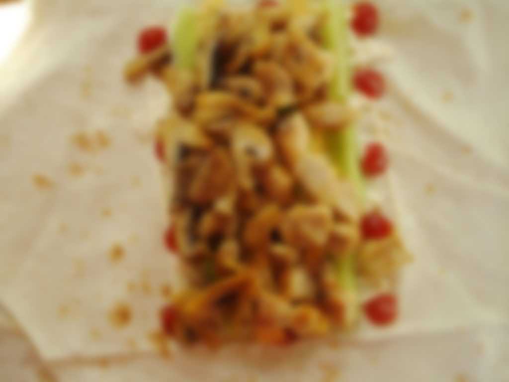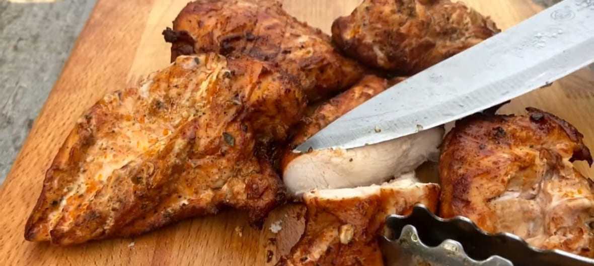 Копчение! Идеально, если в рецепте используется копченая грудка по этому рецепту: замариновать за 20 минут 1 кг курицы в 1 ч. л. соли, 1 ч. л. копченой паприки, 0,5 ч. л. мускатного ореха и 2 ч. л. майорана. Добавить черный перец и пару ложек оливкового масла. Сначала обжарить по 5 минут на открытых углях с каждой стороны, а затем сдвинуть, добавить замоченную яблоневую щепу и готовить еще 20–30 минут.