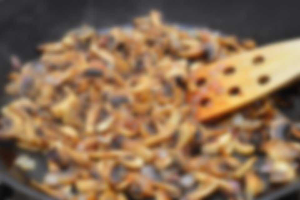 - Начинаем с приготовления начинки. Обжариваем на чуть смазанной маслом сковороде шампиньоны, не забываем посолить и поперчить в конце.