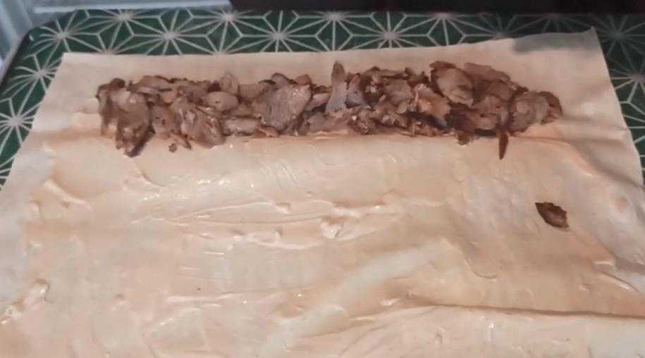 9. Лаваш развернуть. С нижнего края, с небольшим отступом от трех сторон намазать соус. Сверху выложить всю начинку и снова покрыть небольшим слоем заливки. Завернуть аккуратно и плотно. Сначала согните нижний край, вместе с начинкой. Затем накройте боковыми сторонами и продолжите сварачивание вверх.