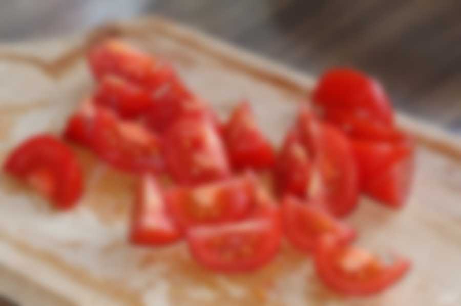 - Пока основной ингредиент готовится, моем помидоры, обсушиваем их бумажными салфетками и измельчаем на полукольца.