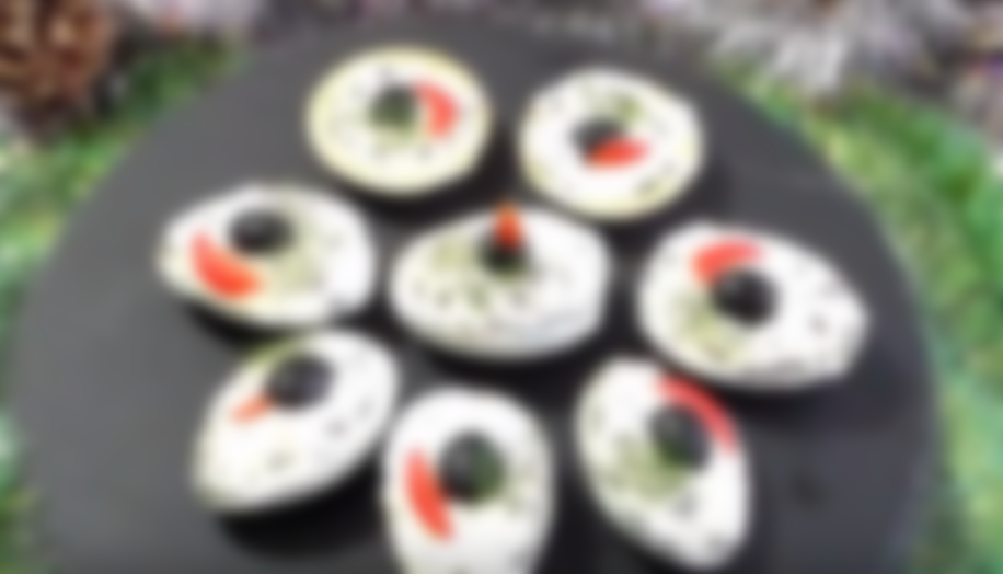 - Еще одна «симпатичная» анималистическая идея — пчелы из черных и зеленых маслин. Разрежьте ягоды поперек на колечки, чередуя черные и зеленые, соберите тельце пчелок, выложите на фаршированные яйца. Усики можно сделать из укропа.