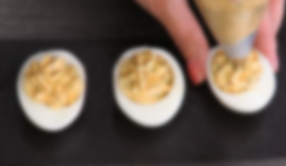 - С помощью кулинарного шприца распределите фарш по белкам яиц.